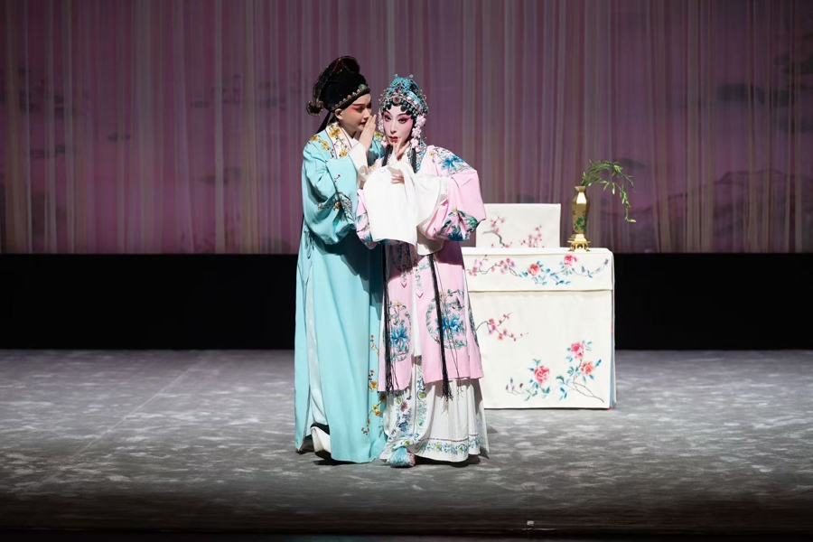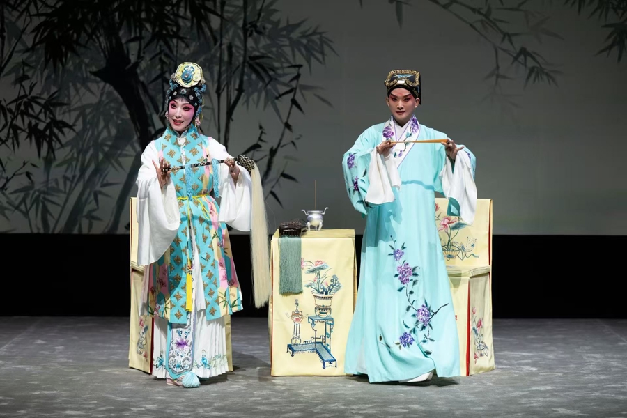《玉簪记》拉开专场演出的序幕。韩宜珈饰演的陈妙常,从道心寂寂到凡心萌动,时而肃然、时而娇嗔,与昆曲小生名家胡维露饰演的潘必正碰撞出动人的火花,成功演绎了一出古典浪漫的爱情轻喜剧,欢声笑语与甜蜜氛围洋溢全场。